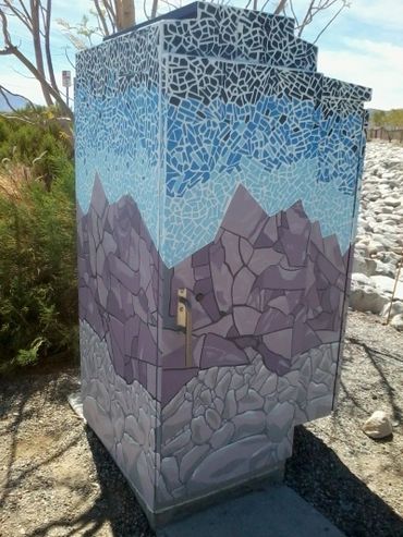She’s contributed to this community by painting two beautiful utility boxes, THE SPIRIT OF DHS, by Mission Lakes and No. Indian Canyon and at Skybourne, replicating in paint the rock, slate and mosaics on their magnificent monoliths.